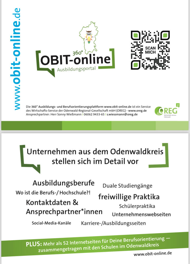 Neben dem einen OBIT-Tag für die berufliche Orientierung an den Schulen, gibt es seit September 2021 mit www.obit-online.de die 360° Ausbildungs- und Berufsorientierungsplattform für den Odenwaldkreis und seine Schüler.